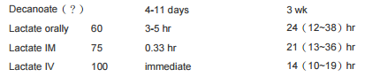 【已刪除】63.有關haloperidol劑型之敘述,下列何者正確? (A)Haloperidol lactate為脂溶性,配方於胡麻油可供肌肉注射 (B)Haloperidol lactate為水溶性,僅可供口服給藥 (C)Haloperidol deconate為脂溶性,肌肉注射間隔為4週 (D)Haloperidol deconate為水溶性,肌肉注射約20分鐘可達尖峰濃度