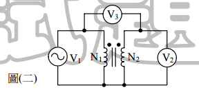 14.若圖(二)中之變壓器的極性已知,且匝數比N1:N2=1:2,當V1=110V時,交流電壓表V2與V3的讀值分別為多少? (A)220V,330V (B)220V,–110V (C)220V,–330V (D)220V,110V