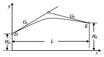 , 其中 y 為高程值,x 為豎曲線任一點至其起點之水平長度,L 為豎曲線的總水平長度, 其起點為 D,起點高程為 H