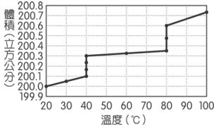 (A) 此物質的沸點為 80 ℃ (B) 熔化期間,固體會浮於液體上面 (C) 從氣體變成液體時,體積會膨脹 (D) 加熱時,液態比固態易於升溫 (E) 溫度升高一度,液態時的體積膨脹比固體時大。(應選二項)