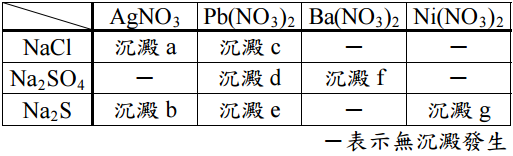 【已刪除】36.下表是硝酸銀、硝酸鉛、硝酸鋇、硝酸鎳等四種溶液分別與氯化鈉、硫酸鈉、硫化鈉等三種溶液反 應的結果(所有溶液的濃度都是 0.01 M)。