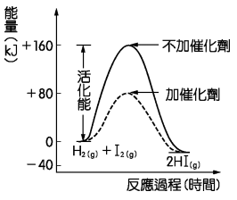 (A)碘化氫的生成為放熱反應 (B)碘的昇華為吸熱反應 (C)加入催化劑時,只增加碘化氫的生成速率 (D)若正反應的活化能為 169 kJ 時,逆反應的活化能則為 178 kJ (E)在達到化學反應平衡狀態時,正反應與逆反應的速率都是 0。(應選三項)