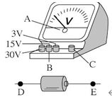3.( )如附圖為一伏特計及電池組,則下列敘述何者正確?(圖中B為伏特計正極、C為伏特計負極)(A)測量電池電壓的正確接法為B接E,C接D (B)測量電池電壓的正確接法為B接D,C接E (C)測量未知電壓時,必須先選擇15V的電壓範圍做測試 (D)測量未知電壓時,必須先選擇3V的電壓範圍做測試。