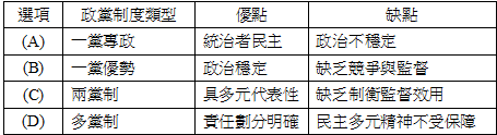 18. 政黨的主要目的在於贏得選舉,取得政權,組織政府。政黨的多寡與競爭程度,對於民主政治與政治穩定具有一定的影響。然各類型之政黨制度皆各有其優缺點。試就上述,下列哪些政黨制度優缺點比較說明正確?(A)(B)(C)(D)