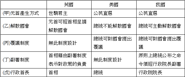 21. 花美男將英國、美國與我國中央政府體制的特點加以比較,但因上課不專心,表格中出現錯誤。請協助花美男找出錯誤之處。 (A)甲乙丙 (B)甲乙丁 (C)甲丙戊 (D)乙丁戊。