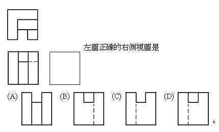109. 在正投影視圖中所形成的線條,一般均由物體 (A)面的邊視 (B)面與面的交線 (C)面的極限 (D)以上皆可能 型態所形成。