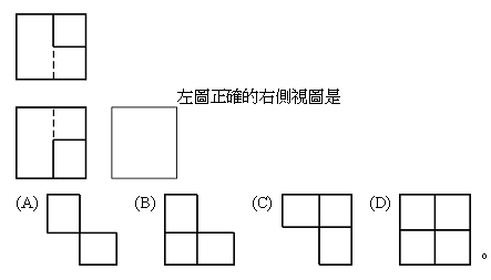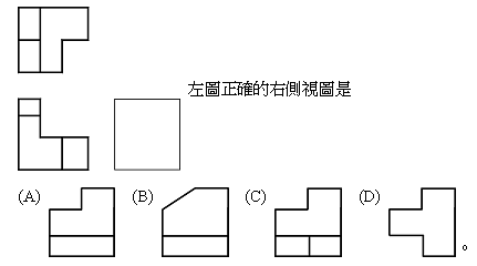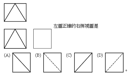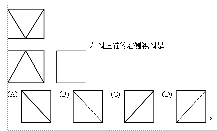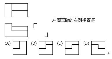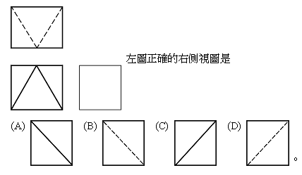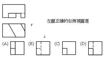 112. 當前視圖與俯視圖各均為一等長的垂直線時,其右側視圖呈現為 (A)一條60°斜線 (B)一條垂直線 (C)一條水平線 (D)一條45°斜線。