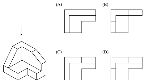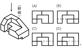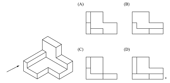 137. 針對下圖所示立體圖,請依箭頭指示方向選出正確的俯視圖。