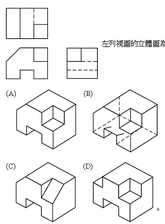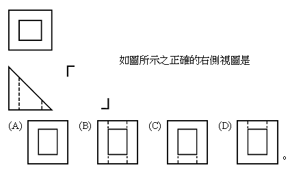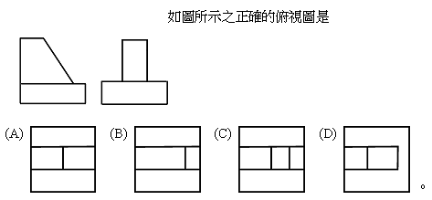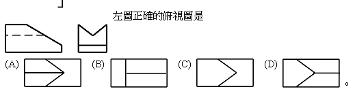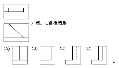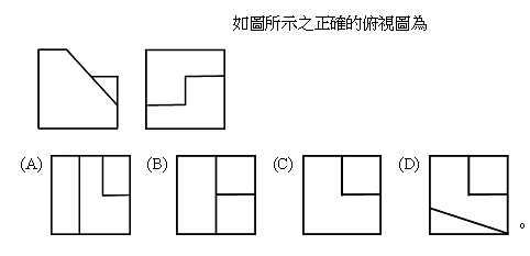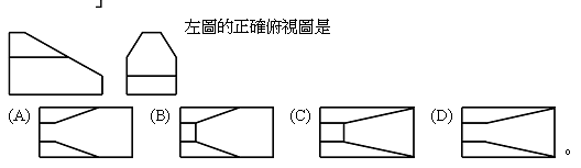 22. 一個單斜面在三個主要視圖中呈現 (A)一縮小的面和二線段 (B)二縮小的面和一線段 (C)三線段 (D)三縮小的面。