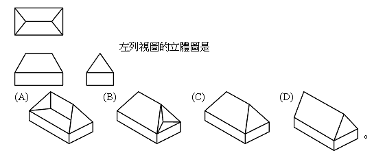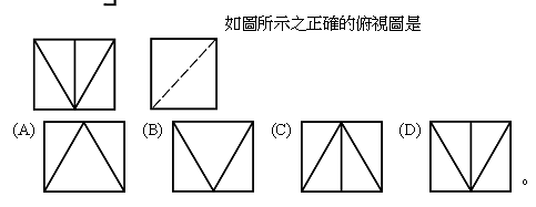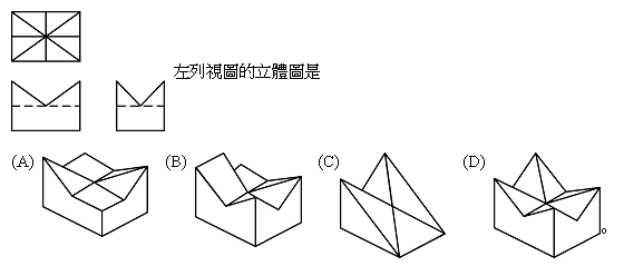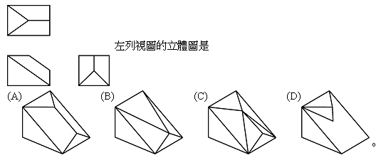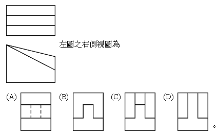 3. 複斜面(歪面)為三角形平面時,其三視圖均呈現為 (A)一條直線 (B)二條直線 (C)三角形 (D)四角形。