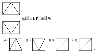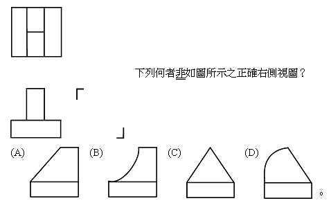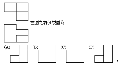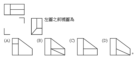 35. 在投影箱側平面上所得的投影視圖,稱為 (A)前視圖 (B)俯視圖 (C)仰視圖 (D)側視圖。