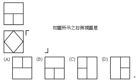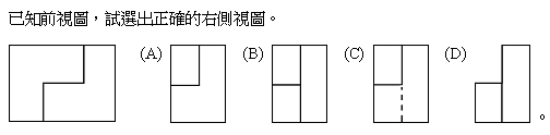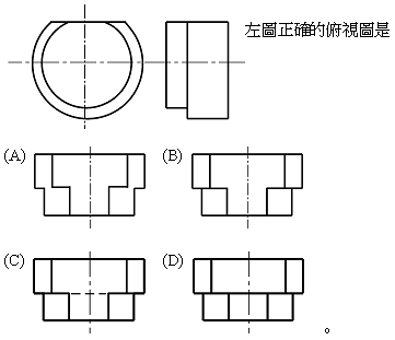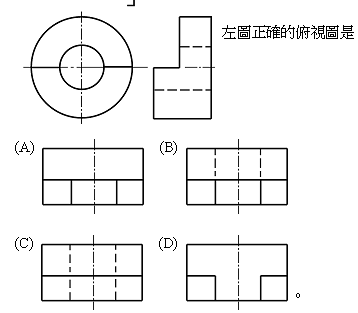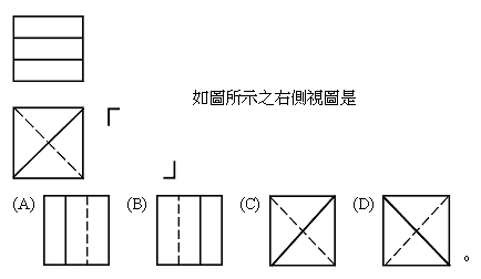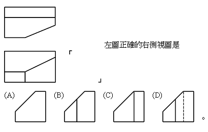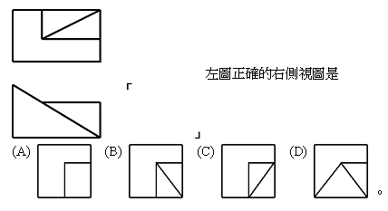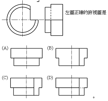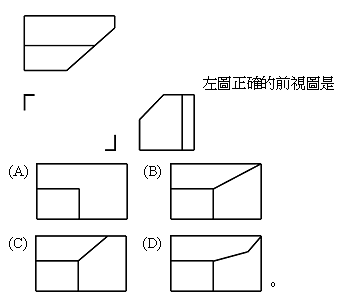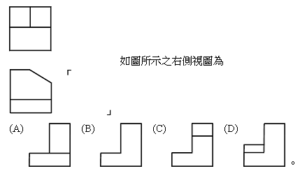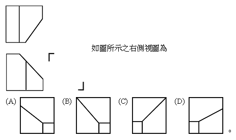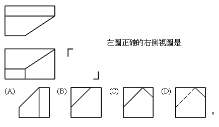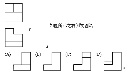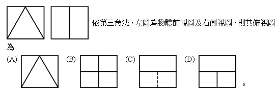 162. 正投影中,水平投影面的視圖為 (A)右、左側視圖 (B)前、後視圖 (C)俯、仰視圖 (D)邊視圖。