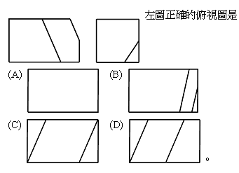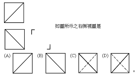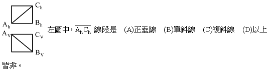 190. 若在空間上的兩平行的複斜線,下面之敘述何者正確? (A)在俯視圖亦為二條平行線 (B)在前視圖亦為二條平行線 (C)在側視圖亦為二條平行線 (D)以上皆可。