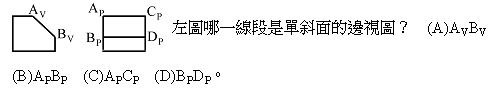 161. 一直線與投影面垂直,所得的正投影視圖,稱為此直線的 (A)斜視圖 (B)端視圖 (C)透視圖 (D)邊視圖。