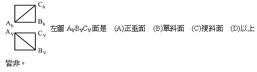 155. 一面與三主要投影面都不平行,則此面稱為 (A)水平面 (B)正垂面 (C)單斜面 (D)複斜面。