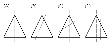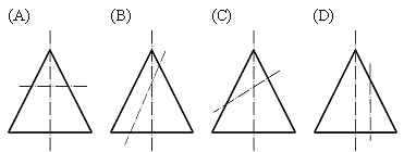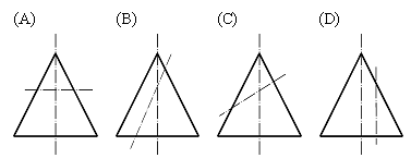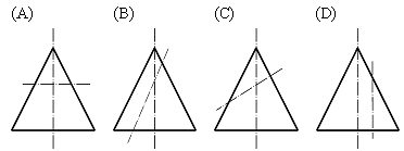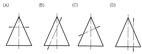 35. 以割面切割直立圓錐時,下列何種切割方式所形成之曲線為正圓?