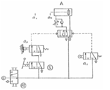 4. 依照一般繪氣壓迴路圖原則,下圖中何者有錯誤?(A)氣源開關(AS)(B)啟動開關(S)(C)極限開關 a
