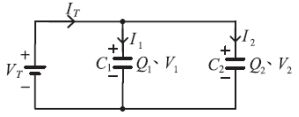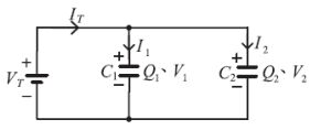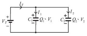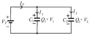 51.如圖之電容器並聯電路,若VT = 10V,C1 = 2μF,C2 = 3μF。求總等效電量? (A)20uC(B)30uC(C)50uC(D)60uC