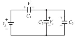 60.如圖所示電路,若直流電壓源 VS = 120V,C1 = 10μF、C2 = 20μF、 C3 = 30μF,則電壓 V1 與 V2 分別為何?(統測 112) (A) V1 = 20V、V2 = 100V (B) V1 = 60V、V2 = 60V (C) V1 = 80V、V2 = 40V (D) V1 = 100V、V2 = 20V