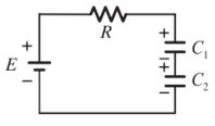 62.如圖所示,電容器 C1 = 9μF、C2 = 18μF,電阻,直流電源 E = 24V,當電路 已達穩定狀態,則下列敘述何者正確?(統測 105)(A) 電容器 C1 的電壓為 12V (B) 電容器 C2 的電壓為 16V (C) 儲存於電容器 C1 的電量為 144μC (D) 儲存於電容器 C2 的電量為 216μC
