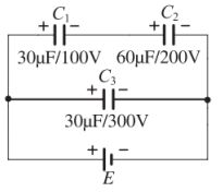 65.如圖所示之串並聯電路,其三個電容規格分別為 30μF/100V、60μF/200V 及30μF/300V,則電路中 E 可加之最大電壓為何?(統測 102) (A)100V (B)150V (C)200V (D)300V