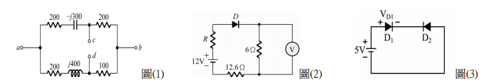 2. 如圖(1)所示電路,在 a、b 兩端加入 100V 之正弦電壓,則 c、d 兩點電壓為 (A)20 (B)44.7 (C)46.5 (D)50 伏特