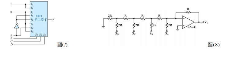9. 如圖(7)所示,是以多工器執行組合邏輯電路功能之電路,此組合邏輯電路之輸出 f (A, B, C, D)為何(已知 S