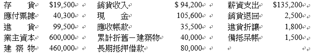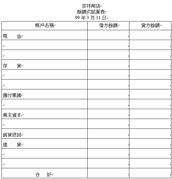 【已刪除】三、試算表(@列1分,15分) 吉祥商店99年3月底各帳戶餘額如下,試編製餘額式試算表。