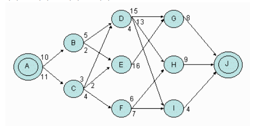 18. 下圖中每個邊上的數字代表兩個點之間的距離,請問 A 點到 J 點之間最短的距離為何? (A)21 (B)22 (C)23 (D)26。