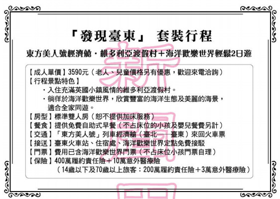 阿華夫婦帶著就讀幼稚園的小孩參加這套行程,三人入住一間標準雙人房。下列敘述,何者符合套裝行程的內容? (A)三人皆支付了基本費用3590元 (B)他們皆可免費享用渡假村的自助式早餐 (C)他們須額外購買一張海洋歡樂世界的門票 (D)小孩意外受傷,醫療險最高賠償額度為十萬元 ,