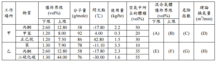 【已刪除】四、請依下表給予的資訊(狀態:一大氣壓力,25℃),計算甲、乙作業場所內的爆炸 上限、爆炸下限及危險指數。(12 分)為避免工作場所達到爆炸界限,依「勞工安 全衛生設施規則」,請計算其理論換氣量。(8 分)※需詳列計算過程。