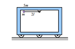 【已刪除】五、質量為 5m 的車廂內懸掛一單擺,單擺質量為 m,桿長為 2l,細桿的質量可忽略不 計。今將單擺移至水平位置(如下圖)後由靜止釋放,假設摩擦忽略不計,試求單 擺在垂直位置(擺錘落至最低點處)時,擺錘的速度與車廂的速度,並註明其方向。 (20 分)