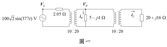 一、如果圖一所示電路中的兩個變壓器均可假設為理想,且其各自的線圈匝數比如圖中 V i 所標示,試問該電路中的電壓比例