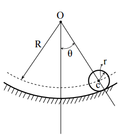 【已刪除】二、有一圓球在圓柱曲面(半徑為 R + r)上做小振幅之滾動(sin θ ≑ θ)其參數如下圖, 求此圓球之滾動的頻率。(註:圓球之半徑為 r,質量為 m,球心為 c)(25 分)