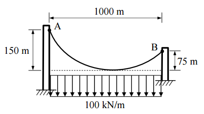 【已刪除】一、吊橋之鋼纜如下圖承受 100 kN/m 之均佈荷重,試求此鋼纜在 A、B 兩點之張力。 (25 分)