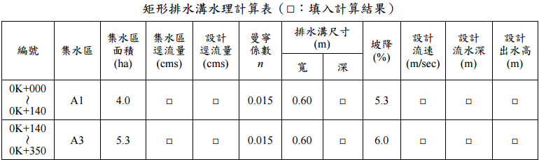 【已刪除】四、某單位欲於山坡地開闢一條公路,長度為 350 m,道路縱坡如下:0K+000~0K+140 為-5.3%,0K+140~0K+350 為+6.0%,集水區排水分區面積(虛線)A1、A2 及 A3, 如圖所示。假設設計降雨強度為 I=150.0 mm/hr,逕流係數 C=0.75,曼寧係數 n=0.015。 請完成下面道路各里程矩形排水溝水理計算表。(先重繪表格於試卷紙上,再填入計 算結果,並於表格下方附上簡略計算式)(20 分)