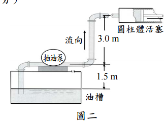 【已刪除】二、圖二為抽油泵將比重 0.85 的油從油槽送至上端之圓柱體活塞,活塞內徑為 150 mm, 而活塞每 10 秒均位移 500 mm,並產生 5000 公斤重之作用力。當吸送油管之內徑 皆為 15 mm,且吸油段之能量損失為 3.5 m,送油段之能量損失為 10.5 m 時,試求 抽油泵之功率。(10 分)
