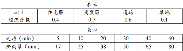 【已刪除】七、新市鎮面積有 50 公頃,其中住宅區有 30 公頃,商業區有 10 公頃,道路有 5 公頃, 及 5 公頃草地,已知各區之逕流係數如表三所示,排水系統設計再現期為 10 年,其 最大降雨量與延時之關係如表四,假設雨水進入排水系統上游時間為 10 分鐘,密閉 排水系統長度為 2000 m,而設計流速為 1 m/s,試以合理法(rational method)公式求 排水系統出口之尖峰流量(以 cms 表示)。(15 分)