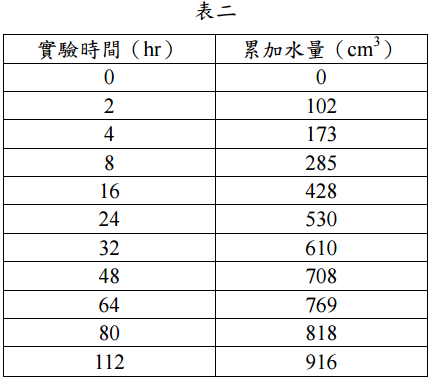 【已刪除】六、利用同心圓雙筒式入滲計來量測掩埋場阻水層入滲量,內筒直徑為 30 cm,且實驗 過程內外筒水深皆維持 30 cm。實驗結束阻水層之飽和深度為 2 cm,內筒所累加水 量記錄如表二,試求該阻水層之現地透水係數。(以 cm/s 表示)(15 分)