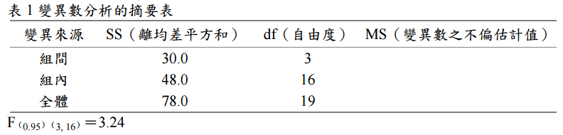 【已刪除】五、表 1 乃某變異數分析的摘要表,請求出組間變異數之不偏估計值(MS