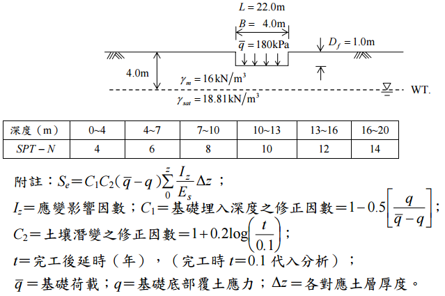 , 基礎之設計承載力q =180 kPa,請採用 Schmertmann 及 Hartman 公式(見附註)分 析此基礎於完工時至完工 2 年後期間內預期發生的沉陷量為何?基址處之標準貫入數 N 值數據如下表,請以 E
