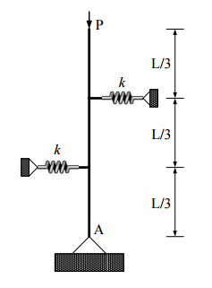 【已刪除】二、一支二維剛性柱如圖所示,柱頂為自由端承受向下垂直作用力 P,柱底 A 點為鉸支承, 柱高 L=9 m,柱高 3 m 及 6 m 處各有一支可水平位移的彈簧,彈簧係數 k=10 kN/m, 計算此柱的臨界挫屈載重 P
