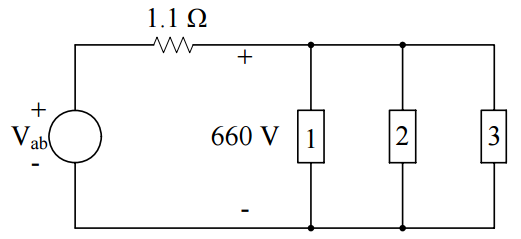【已刪除】三、下列之負載並聯於 660 伏特之交流線路: 負載一,15 仟瓦,功率因數 0.6 滯後 負載二,20 仟瓦,功率因數 0.707 超前 負載三,10 仟瓦,功率因數 0.4 滯後 此等負載經由電阻為 1.1 歐姆,電抗可忽略之電纜連接於變電所,求變電所之電壓。 (20 分)