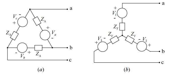 ,試推導下面(a)、(b)兩等效實際三相電 源之電壓源與阻抗間的關係。(20 分)
