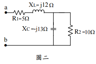 【已刪除】五、如圖二之交流電路,當於 ab 二端外加 220V 之台電交流電源,請計算流入之電流均 方根值與實功率。(15 分)