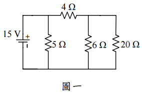 【已刪除】二、如圖一之電路共有四個電阻器,請計算由電源流出之電流與功率。(15 分)