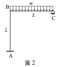 【已刪除】四、圖 2 為一平面剛架。梁AB承受垂直均佈載重w = 4 kN/m。L = 6 m。各桿件的E值相 同,為 200 GPa,柱AB的I值為 2×10