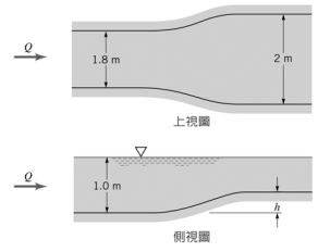 【已刪除】四、透過一個平滑過渡區段銜接二個矩形渠道,如圖所示,在每個渠道的水面高度都相 同的情況下,渠寬由 1.8 m 增加至 2 m;假設流動的上游水深為 1 m,試決定欲維持 相同水面高度的需求下,渠底必須提升多少公尺(即 h =?),水流方能順利橫越 過渡區段?(20 分)