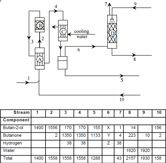 【已刪除】五、工業上製造丁酮所涉及的單元操作如下圖,此圖為簡化過後的流程圖。其中B代表 化學反應槽內進行 2-丁醇的脫氫反應而生成丁酮,反應溫度為 450℃,並以氧化鋅 作為催化劑。下表有各支流詳細的組成和流速資料,單位為kg h