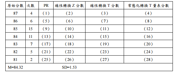 【已刪除】三、請針對以下○○縣市全縣市學生查字典比賽成績分布列表(模擬資料),使用單值 組距法計算其對應百分等級(percentile rank, PR),再將其分別轉換成線性轉換 (linear transformation)Z 分數及 T 分數、常態化轉換(normalized transformation) T 量表分數。(運算及查表若有小數,可四捨五入取至小數點以下二位內,表格部 份答案請寫於答案紙上,並標示項目序號)(每格 1 分,共 28 分)